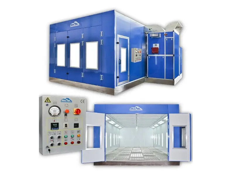 Окрасочно-сушильная камера оснащена кабиной современного внешнего вида с конструкцией из окрашенных стеновых панелей с тепло- и звукоизоляцией. Кабина оснащается 3-створчатыми въездными воротами и сервисной дверью.