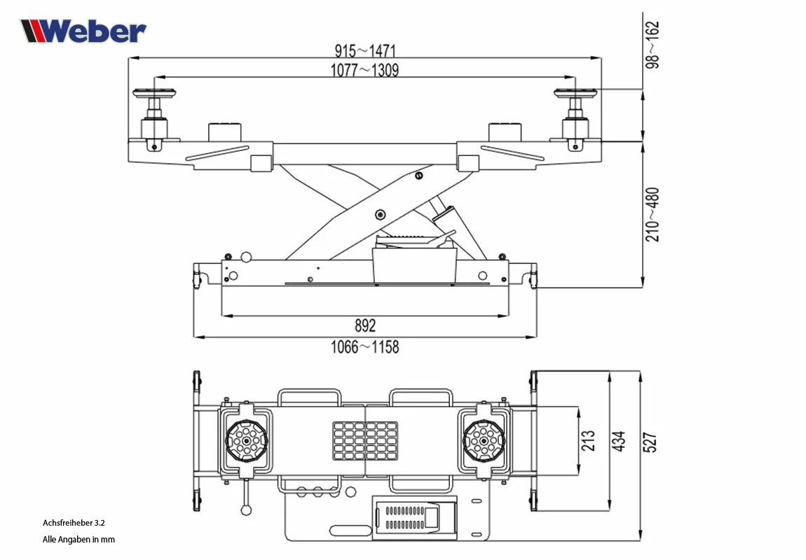 Модель Weber Achsfreiheber 3.2 выполнена в ножничной конструкции, что обеспечивает устойчивость и равномерное распределение нагрузки.