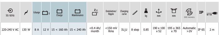Ёмкость зарядки: от 15 до 160 А·ч (до 240 А·ч — в режиме поддержания)